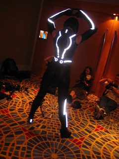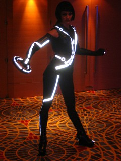 My Quorra costume was constructed by me. Chest and arm armour constructed from scratch out of craft foam, cardboard, styrofoam and tons of super glue ;) Suit and identity disk are made with reflective tape. These photos are taken with flash photography which create the light up effect. I am currently working on lighting the suit for the movie premiere December 2010.Photos